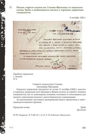 Письмо старосте колхоза им. Сталина Фрольцеву от городского головы Трубы о необходимости выслать в городское управление специалистов. 8 октября 1942 г.
