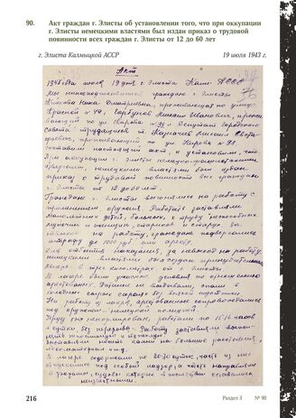 Акт граждан г. Элисты об установлении того, что при оккупации г. Элисты немецкими властями был издан приказ о трудовой повинности всех граждан г. Элисты от 12 до 60 лет. г. Элиста, Калмыцкой АССР, 19 июля 1943 г. // БУ РК «Нацархив». Ф. P-68. Oп. 1. Д. 5. Л. 27-27об. Копия. Рукопись.