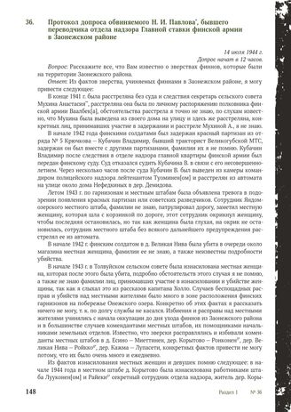 Протокол допроса обвиняемого Н.И. Павлова, бывшего переводчика отдела надзора Главной ставки финской армии в Заонежском районе. 14 июля 1944 г.