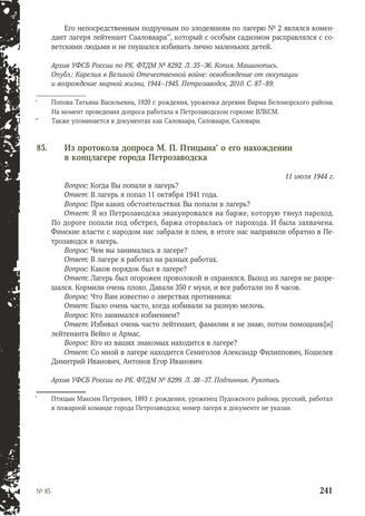 Из протокола допроса М.П. Птицына о его нахождении в концлагере города Петрозаводска. 11 июля 1944 г.