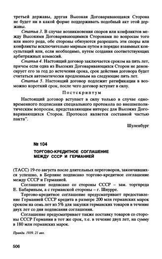 Торгово-кредитное соглашение между СССР и Германией // Правда. 1939. 21 авг.