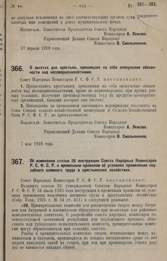 Постановление Совета Народных Комиссаров. Об изменении статьи 26 инструкции Совета Народных Комиссаров Р.С.Ф.С.Р. к временным правилам об условиях применения подсобного наемного труда в крестьянских хозяйствах. 7 мая 1928 года