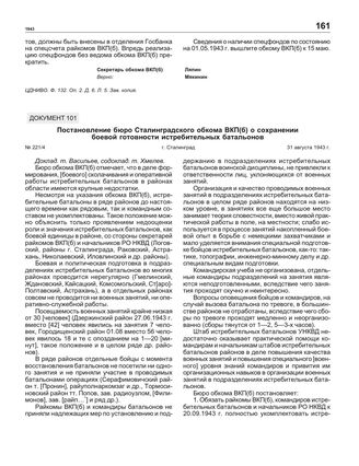 Постановление бюро Сталинградского обкома ВКП(б) о сохранении боевой готовности истребительных батальонов. г. Сталинград, 31 августа 1943 г.