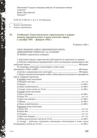 Сообщение Севастопольского горисполкома о нормах выдачи продовольствия и мыла жителям города в декабре 1941 - феврале 1942 г. 27 февраля 1942 г. // ГА РК. Ф. П-35. Оп. 1. Д. 230. Л. 54-55. Копия.