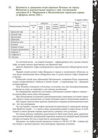 Ведомость о движении остро-заразных больных по городу Феодосии и пояснительная записка к ней, составленная доктором Н.А. Мироновым в Феодосийскую городскую управу за февраль месяц 1943 г. 4 марта 1943 г. // ГА РК. Ф. P-1458. Оп. 1. Д 2. Л. 198-198 об. Подлинник.