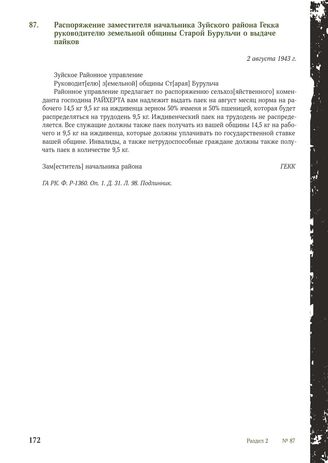 Распоряжение заместителя начальника Зуйского района Гекка руководителю земельной общины Старой Бурульчи о выдаче пайков. 2 августа 1943 г.