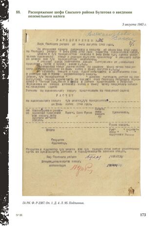 Распоряжение шефа Сакского района Булатова о введении поземельного налога. 3 августа 1943 г. // ГА РК. Ф. P-2387. Оп. 1. Д. 4. Л. 95. Подлинник.