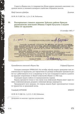 Распоряжение главного агронома Зуйского района Кракупа руководителю земельной общины Старой Бугульчи о выдаче пайка по трудодням. 13 октября 1943 г.