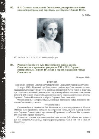 Решение Народного суда Центрального района города Севастополя о признании умершими Г.И. и Л. И. Слуцких, расстрелянных 12 июля 1942 года в период оккупации города Севастополя. 29 марта 1946 г.