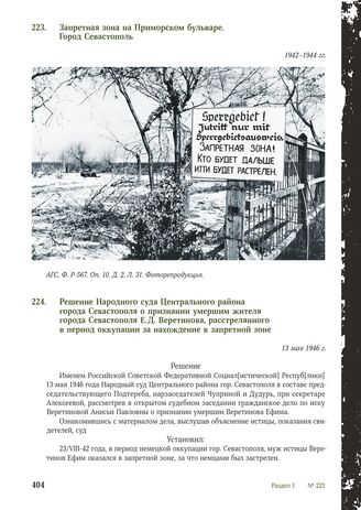 Решение Народного суда Центрального района города Севастополя о признании умершим жителя города Севастополя Е.Д. Веретинова, расстрелянного в период оккупации за нахождение в запретной зоне. 13 мая 1946 г.