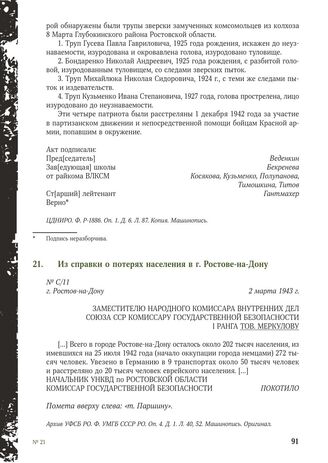 Из справки о потерях населения в г. Ростове-на-Дону № С/11. г. Ростов-на-Дону, 2 марта 1943 г. // Архив УФСБ РО. Ф. УМГБ СССР РО. Оп. 4. Д. 1. Л. 40, 52. Машинопись. Оригинал.