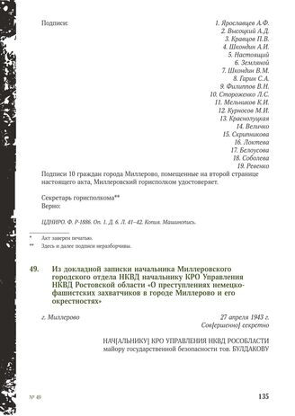 Из докладной записки начальника Миллеровского городского отдела НКВД начальнику КРО Управления НКВД Ростовской области «О преступлениях немецко- фашистских захватчиков в городе Миллерово и его окрестностях». г. Миллерово, 27 апреля 1943 г.