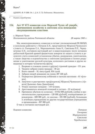 Акт № 673 комиссии села Морской Чулек об ущербе, причиненном хозяйству и жителям села немецкими оккупационными властями. с. Морской Чулек Неклиновского района Ростовской области, 28 марта 1943 г. // ЦДНИРО. Ф. P-1886. Оп. 1. Д. 7. Л. 20. Копия. Машинопись.