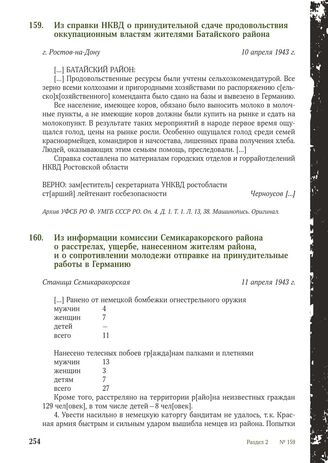 Из информации комиссии Семикаракорского района о расстрелах, ущербе, нанесенном жителям района, и о сопротивлении молодежи отправке на принудительные работы в Германию. Станица Семикаракорская, 11 апреля 1943 г. // ЦДНИРО. Ф. P-1886. Оп. 1. Д. 8. Л. 159. Подлинник. Машинопись.