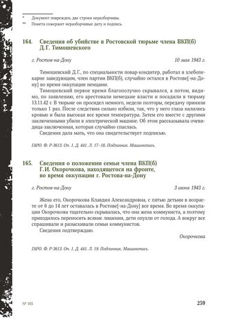 Сведения об убийстве в Ростовской тюрьме члена ВКП(б) Д.Г. Тимошевского. г. Ростов-на-Дону, 10 мая 1943 г. // ГАРО. Ф. P-3613. Оп. 1. Д. 441. Л. 17-18. Подлинник. Машинопись.