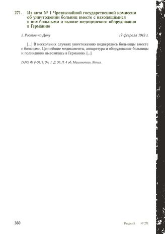 Из акта № 1 Чрезвычайной государственной комиссии об уничтожении больниц вместе с находящимися в них больными и вывозе медицинского оборудования в Германию. г. Ростов-на-Дону, 17 февраля 1943 г. // ГАРО. Ф. P-3613. Оп. 1. Д. 30. Л. 4 об. Машинопись. Копия.