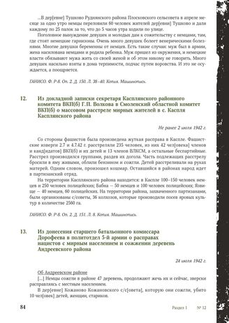 Из донесения старшего батальонного комиссара Дорофеева в политотдел 5-й армии о расправах нацистов с мирным населением и сожжении деревень Андреевского района. 24 июля 1942 г. // ГАНИСО. Ф. Р-8. Оп. 2. Д. 95. Л. 76. Копия. Машинопись.