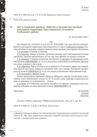 Акт о сожжении деревень, убийстве и насилии над местным населением территории Закустищенского сельсовета Слободского района. 21-23 сентября 1942 г. // ГАСО. Ф. Р-1630. Оп. 2. Д. 26. Л. 36. Копия. Машинопись.