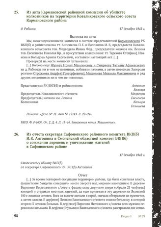 Из акта Кармановской районной комиссии об убийстве колхозников на территории Коваликовского сельского совета Кармановского района. Д. Рябинки, 17 декабря 1942 г. // ГАСО. Ф. Р-1630. Оп. 2. Д. 4. Л. 15-16. Заверенная копия. Машинопись.