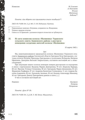 Из акта комиссии колхоза «Малиновка» Угранского сельского совета Знаменского района о расстреле немецкими солдатами жителей колхоза «Малиновка».10 марта 1943 г. // ГАСО. Ф. Р-1630. Оп. 2. Д. 28. Л. 182. Копия. Машинопись.