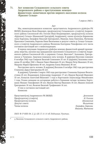Акт комиссии Сельцовского сельского совета Андреевского района о преступлениях немецко-фашистских захватчиков против мирного населения колхоза «Красное Сельцо». 7 апреля 1943 г. // ГАСО. Ф. Р-1630. Оп. 2. Д. 123. Л. 11-11 об. Подлинник. Рукопись.