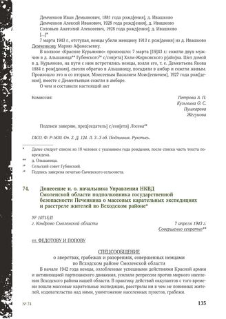 Донесение и. о. начальника Управления НКВД Смоленской области подполковника государственной безопасности Печенкина о массовых карательных экспедициях и расстреле жителей во Всходском районе. Г. Кондрово Смоленской области, 7 апреля 1943 г. // Архив УФСБ России по Смоленской области. Ф. 5. Оп. 1. Д. 11-а. Л. 86-89. Заверенная копия. Машинопись.
