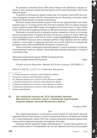 Акт комиссии колхоза им. 43-й стрелковой дивизии Крестовского сельского совета о повешении карательным отрядом мирных жителей Велижского района. 14 апреля 1943 г. // ГАСО. Ф. Р-1630. Оп. 1. Д. 314. Л. 25. Подлинник. Рукопись.
