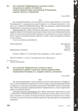 Акт комиссии Трофимовского сельского совета Андреевского района о расстреле немецко-фашистскими оккупантами Степанова А. А., мирного жителя д. Копытово. 5 мая 1943 г. // ГАСО. Ф. Р-1630. Оп. 1. Д. 315. Л. 39. Заверенная копия. Машинопись.