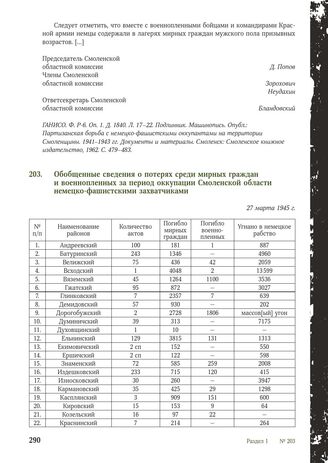 Обобщенные сведения о потерях среди мирных граждан и военнопленных за период оккупации Смоленской области немецко-фашистскими захватчиками. 27 марта 1945 г. // ГАНИСО. Ф. Р-6. Оп. 1. Д. 1840. Л. 78-79. Подлинник. Машинопись.