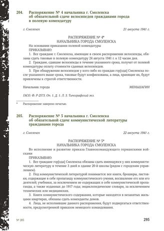 Распоряжение № 5 начальника г. Смоленска об обязательной сдаче коммунистической литературы гражданами города. Г. Смоленск, 22 августа 1941 г. // ГАСО. Ф. Р-2573. Оп. 1. Д. 1. Л. 4. Типографский экз.