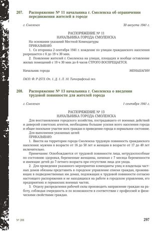 Распоряжение № 13 начальника г. Смоленска о введении трудовой повинности для жителей города. Г. Смоленск, 1 сентября 1941 г.