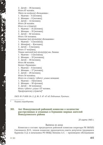 Акт Новодугинской районной комиссии о количестве расстрелянных и угнанных в Германию мирных жителей Новодугинского района. 23 марта 1943 г. // ГАСО. Ф. Р-1630. Оп. 2. Д. 28. Л. 181. Копия. Машинопись.