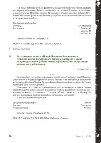 Акт комиссии колхоза «Новый Починок» Захолынского сельского совета Батуринского района о расстреле и угоне на принудительные работы немецко-фашистскими оккупантами мирных жителей колхоза. 28 июня 1943 г. // ГАСО. Ф. Р-1630. Оп. 2. Д. 26. Л. 130-130 об. Подлинник. Рукопись.