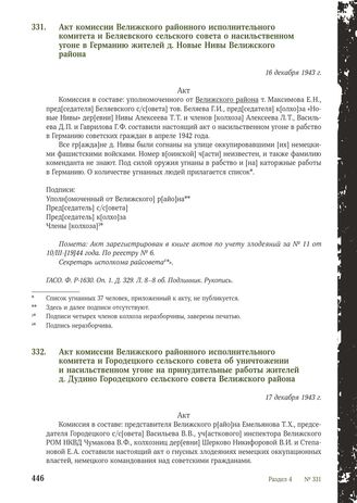 Акт комиссии Велижского районного исполнительного комитета и Городецкого сельского совета об уничтожении и насильственном угоне на принудительные работы жителей д. Дудино Городецкого сельского совета Велижского района. 17 декабря 1943 г.