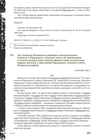 Акт комиссии Велижского районного исполнительного комитета и Городецкого сельского совета об уничтожении и насильственном угоне немецко-фашистскими оккупантами мирных жителей д. Краслевичи Городецкого сельского совета Велижского района. 18 декабря 1943 г.