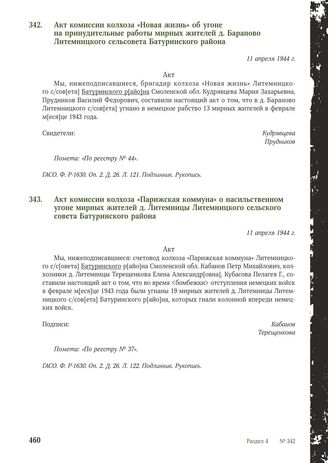 Акт комиссии колхоза «Парижская коммуна» о насильственном угоне мирных жителей д. Литемницы Литемницкого сельского совета Батуринского района. 11 апреля 1944 г. // ГАСО. Ф. Р-1630. Оп. 2. Д. 26. Л. 122. Подлинник. Рукопись.