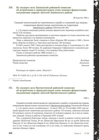 Из сводного акта Знаменской районной комиссии об истреблении и принудительном угоне немецко-фашистскими оккупантами мирных жителей Знаменского района. 28 августа 1944 г. // ГАСО. Ф. Р-2434. Оп. 3. Д. 36. Л. 210-214 об. Подлинник. Рукопись.