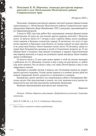 Показания В. М. Марченко, очевидца расстрелов мирных жителей в селе Молотовском Молотовского района Ставропольского края. 29 апреля 1943 г. // ГАСК. Ф. P-1368. Оп. 1. Д. 113. Л. 4. Подлинник. Машинопись.
