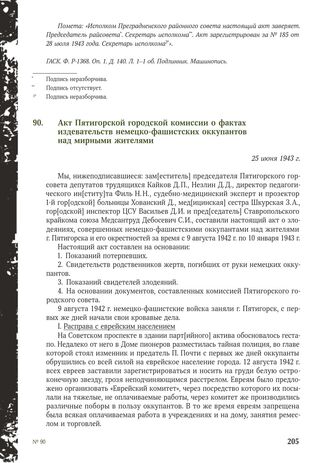 Акт Пятигорской городской комиссии о фактах издевательств немецко-фашистских оккупантов над мирными жителями. 25 июня 1943 г. // ГАСК. Ф. P-1368. Оп. 1. Д. 142. Л. 169-175. Копия. Машинопись.