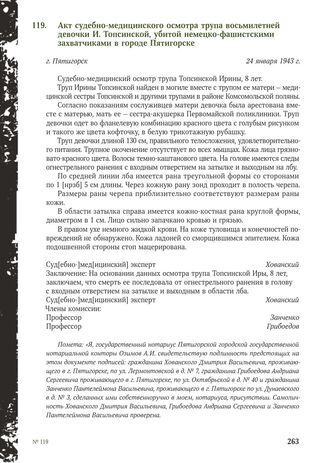 Акт судебно-медицинского осмотра трупа восьмилетней девочки И. Топсинской, убитой немецко-фашистскими захватчиками в городе Пятигорске. г. Пятигорск, 24 января 1943 г.