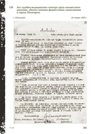 Акт судебно-медицинского осмотра трупа неизвестного мальчика, убитого немецко-фашистскими захватчиками в городе Пятигорске. г. Пятигорск, 24 января 1943 г.