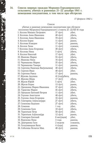 Список мирных граждан Моркино-Городищенского сельсовета, убитых и раненных 21-22 декабря 1941 г. немецкими оккупантами, в том числе при обстрелах. 17 февраля 1942 г. // ТЦДНИ. Ф. 147. Оп. 3. Д. 559. Л. 33-34. Копия. Машинопись.