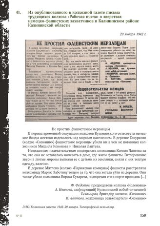 Из опубликованного в колхозной газете письма трудящихся колхоза «Рабочая пчела» о зверствах немецко-фашистских захватчиков в Калининском районе Калининской области. 29 января 1942 г. // ГАТО. Колхозная газета. 1942. 29 января. Типографский экземпляр.