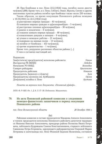 Из акта Пеновской районной комиссии о злодеяниях немецко-фашистских захватчиков в период оккупации Пеновского района. Пос. Пено Великолукской области, 28 декабря 1944 г. // ВЛО ГАПО. Ф. P-1691. Оп. 8. Д. 10. Л. 148-150. Подлинник. Машинопись.