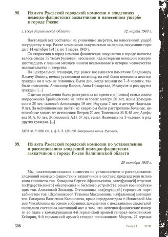 Из акта Ржевской городской комиссии о злодеяниях немецко-фашистских захватчиков и нанесенном ущербе в городе Ржеве. Г. Ржев Калининской области, 12 марта 1943 г. // ГАТО. Ф. P-1928. Оп. 1. Д. 5. Л. 128-130. Заверенная копия. Рукопись.