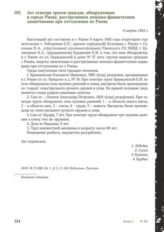 Акт осмотра трупов граждан, обнаруженных в городе Ржеве, расстрелянных немецко-фашистскими захватчиками при отступлении из Ржева. 9 марта 1943 г. // ГАТО. Ф. P-1928. Оп. 1. Д. 5. Л. 104. Подлинник. Рукопись.
