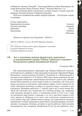 Акт о злодеяниях немецко-фашистских захватчиков в оккупированной деревне Губинке Губинского сельсовета Погорельского района Калининской области. 15 августа 1942 г. // ГАТО. Ф. P-1928. Оп. 1. Д. 9. Л. 50-50 об. Подлинник. Рукопись.