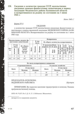 Сведения о количестве граждан СССР, насильственно уведенных немецко-фашистскими захватчиками в период оккупации Медновского района Калининской области и возвратившихся на родину по состоянию на 1 июня 1945 г. Июнь 1945 г.