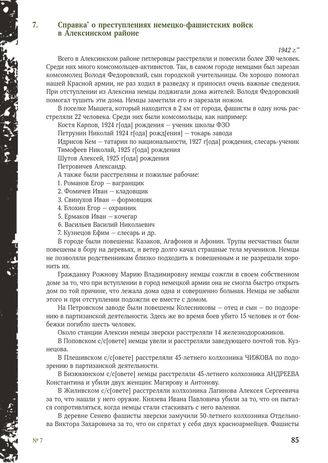 Справка о преступлениях немецко-фашистских войск в Алексинском районе. 1942 г. // ГАТО. Ф. P-2515. Оп. 1. Д. 24. Л. 6-7. Подлинник. Машинопись. Публикуется впервые.