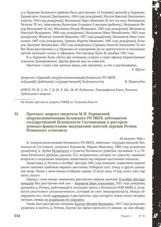 Протокол допроса свидетеля М.И. Корнаковой оперуполномоченным Белевского РО НКГБ лейтенантом государственной безопасности Скотниковым о расстреле немецко-фашистскими оккупантами жителей деревни Ретюнь Ретюнского сельсовета. 24 августа 1944 г.